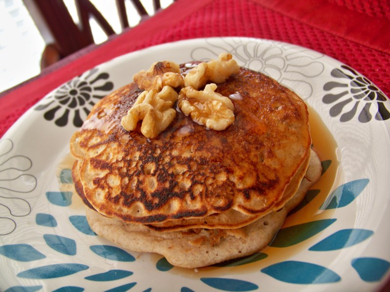 I woke up this morning not feeling too well, and I certainly didn’t want to grab for the fiber-filled healthy cereal. I wanted something mild, something semi-bland, but yet something that would be easy and delicious. The hub pulled out a box of Wheat Blend Hungry Jack Pancake Mix. YUM! All I could think about was pulling out the bag of walnuts I had bought at the grocery store.