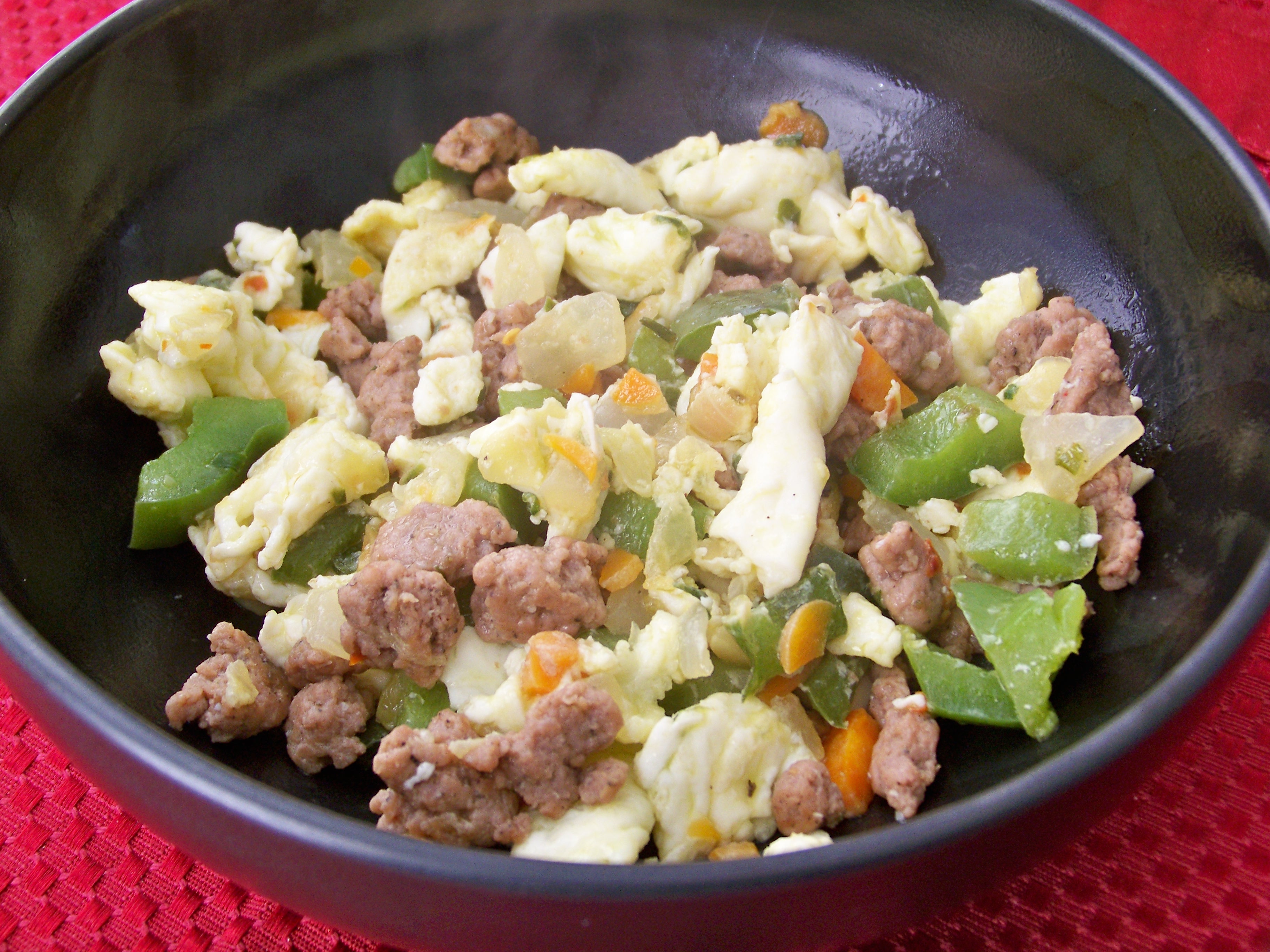 I chopped a green bell pepper (next time I will add a red bell pepper as well), a small onion, a few baby carrots, three cloves of garlic and sautéed them in some extra virgin olive oil until they were all well softened. Now this made enough for about 3 reasonable servings. I added 1/4 cup of the mix to 1/4 cup egg whites for one serving. Surprisingly filling.