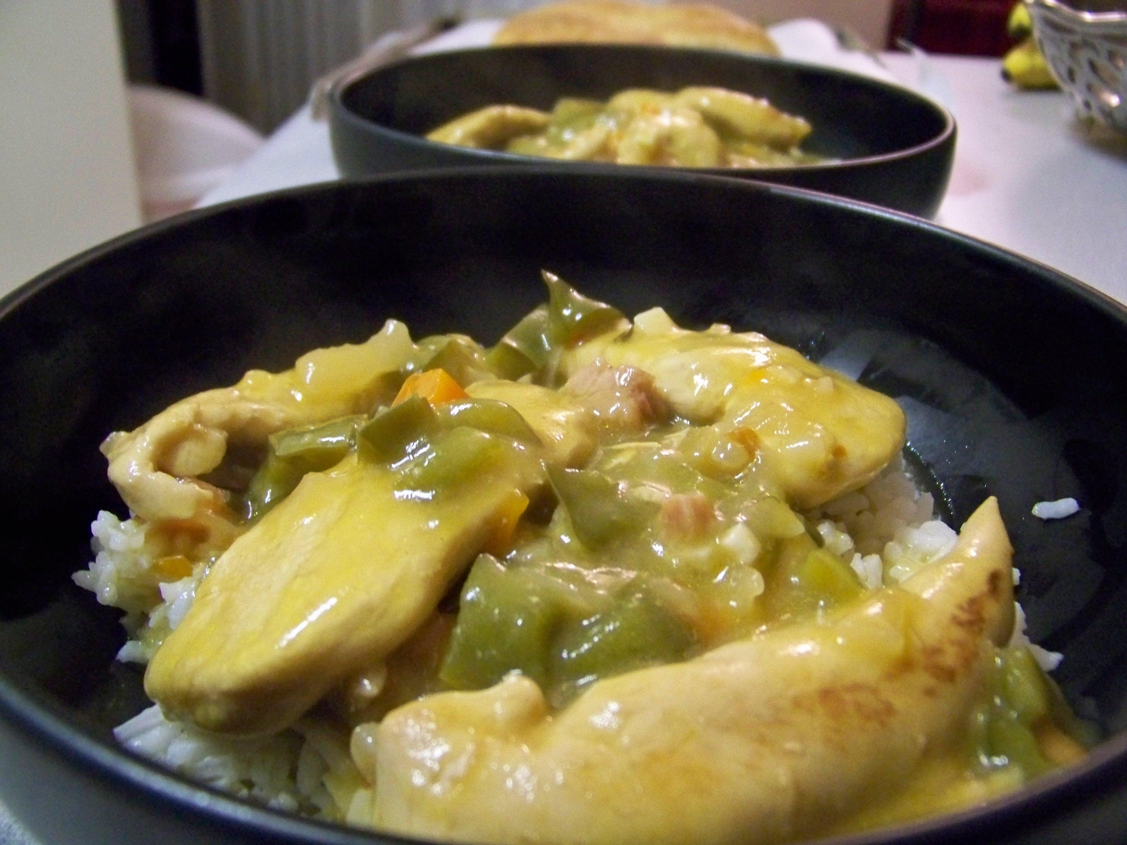 He combined 2 garlic cloves, and some minced onion in a pan with some Extra Virgin Olive Oil and sautéed boneless skinless frozen chicken tenders in it.  Remember that leftover pepper mix that I was eating with my egg whites for my healthy breakfasts???  Yeah, then he mixed my third day’s portion into it…..He added one can of Healthy Request Cream of Chicken Soup, a can full of store-bought vegetable stock, and then he filled that can a 1/3 of the way full of Marsala wine.  He simmered everything on medium-low for 20-30 minutes until his 5 POUNDS OF RICE COOKED!!!  No kidding…it looked like he literally dumped the whole box in with some water!  I asked him if he measured the portions out for the rice…he replied with a hearty no…Let’s just say I am going to be getting creative with some rice the next few days.  Stay tuned for that one…..lol