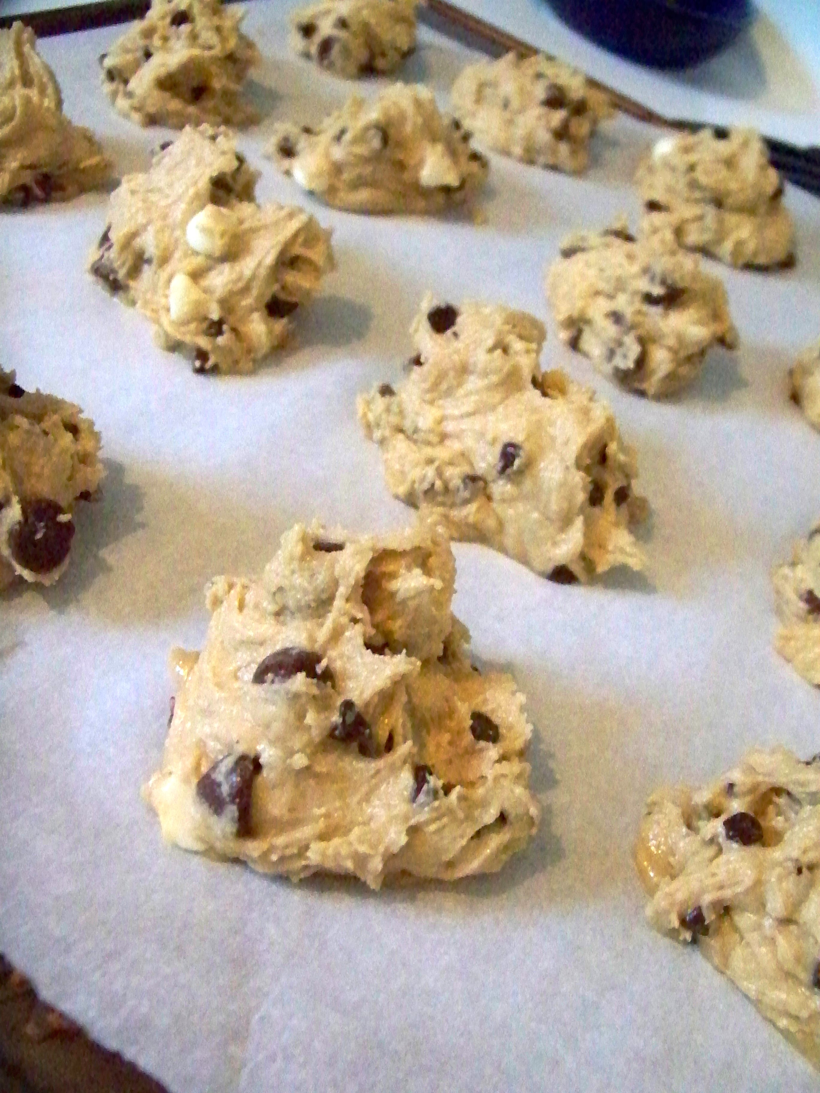 I made the below with semi-sweet morsels, milk chocolate morsels, and white chocolate morsels all combined. They came out quite lovely…and, oh yeah, homemade cookies aren’t meant to come out perfectly round like the pre-packaged pre-made squares you get in the refrigerated section. I personally enjoy the odd shapes…more fun to break apart when coming out of the oven. If one breaks, you eat it…because, you surely can’t give it to someone…it’s broken. The joys of homemade!