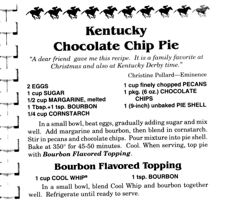On to the pie! One day, one of the few and I were discussing my site. Something sparked his interest, and after a short pause, he returned with a recipe for me to try. A recipe that, in the end, turned out to be quite the popular little pie for a town that holds the key to Churchill Downs. The actual pie’s name is Derby-Pie, a trademarked name of Kern’s Kitchen. You can find the story of the official Derby-Pie by clicking here.