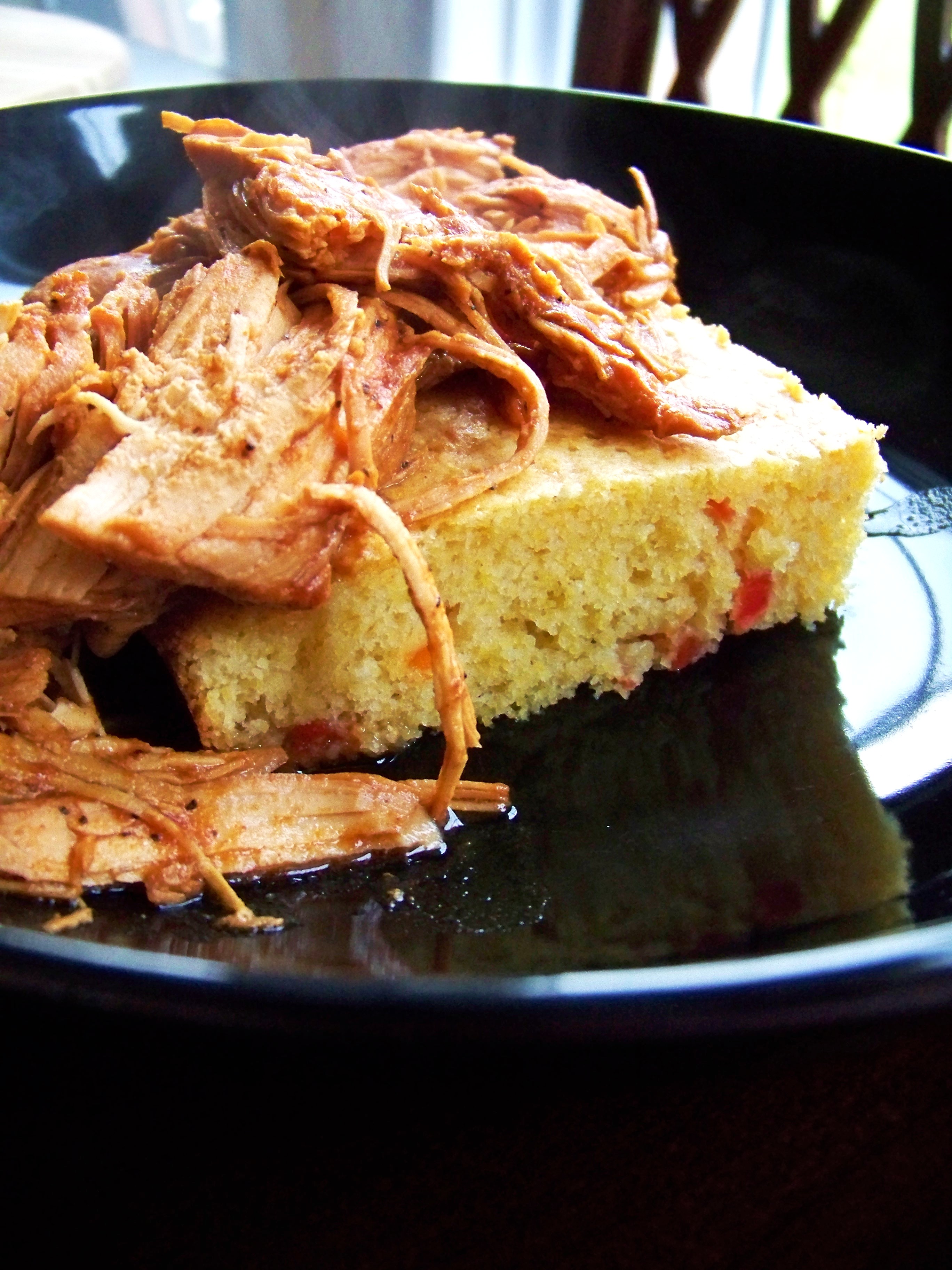 - While baking the cornbread, reach your tongs into the crock pot and begin to pull apart the chicken so it shreds. This way you can get all of the juicy goodness of the sauce on every savory morsel of chicken before serving. Yum!