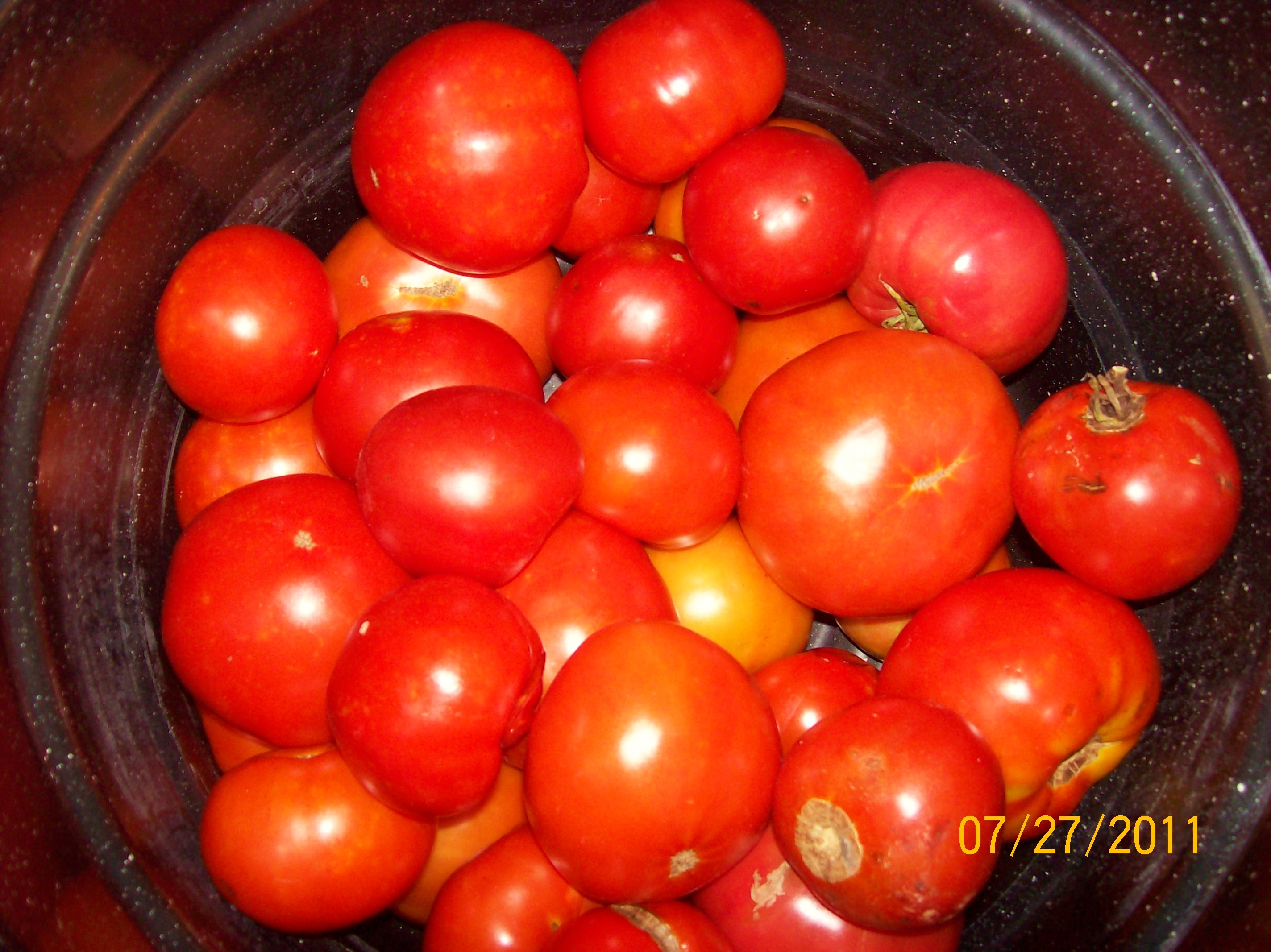 Notes: Cut a small X on the bloom end of the tomatoes and drop them in hot water and then immediately put them in cold water so the skin will remove easily. It also works to fill up your sink with the tomatoes you want to use, make sure the drain stopper is closed, then pour a pot of boiling water into the sink with the tomatoes. Immediately use a long spoon or knife to open the drain stopper and drain the hot water out. Add cold water to the sink to cool tomatoes. Repeat until the tomatoes are cool enough to peel.