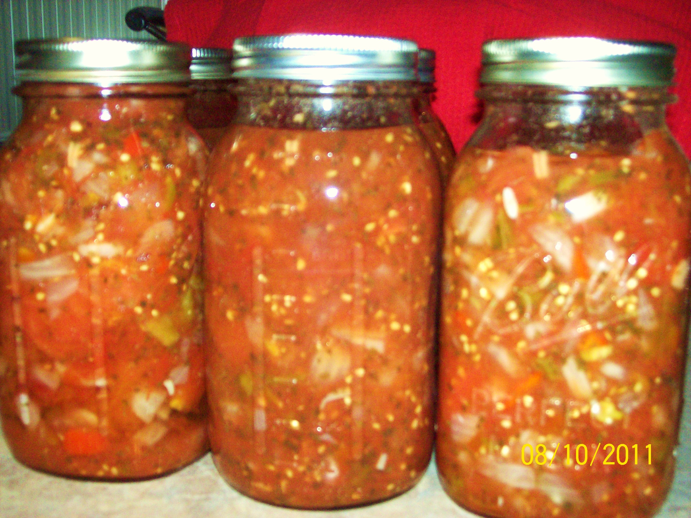 We planted five plants and had around 35 tomatoes the first round, which of course they were not all ready to be picked at the same time. I had to go to my daddy’s to get some from his garden, which was just enough to make my 5 quarts and 1 pint of picante salsa. I also had to borrow my daddy’s water bath. My mother-in-law gave me some cans to use. The Onyx Plate thinks that my southern way of saying cans instead of jars is cute. That is right, I am a southern girl that lives in Stokes County with a little accent and all, which has actually rubbed off on her. LOL!