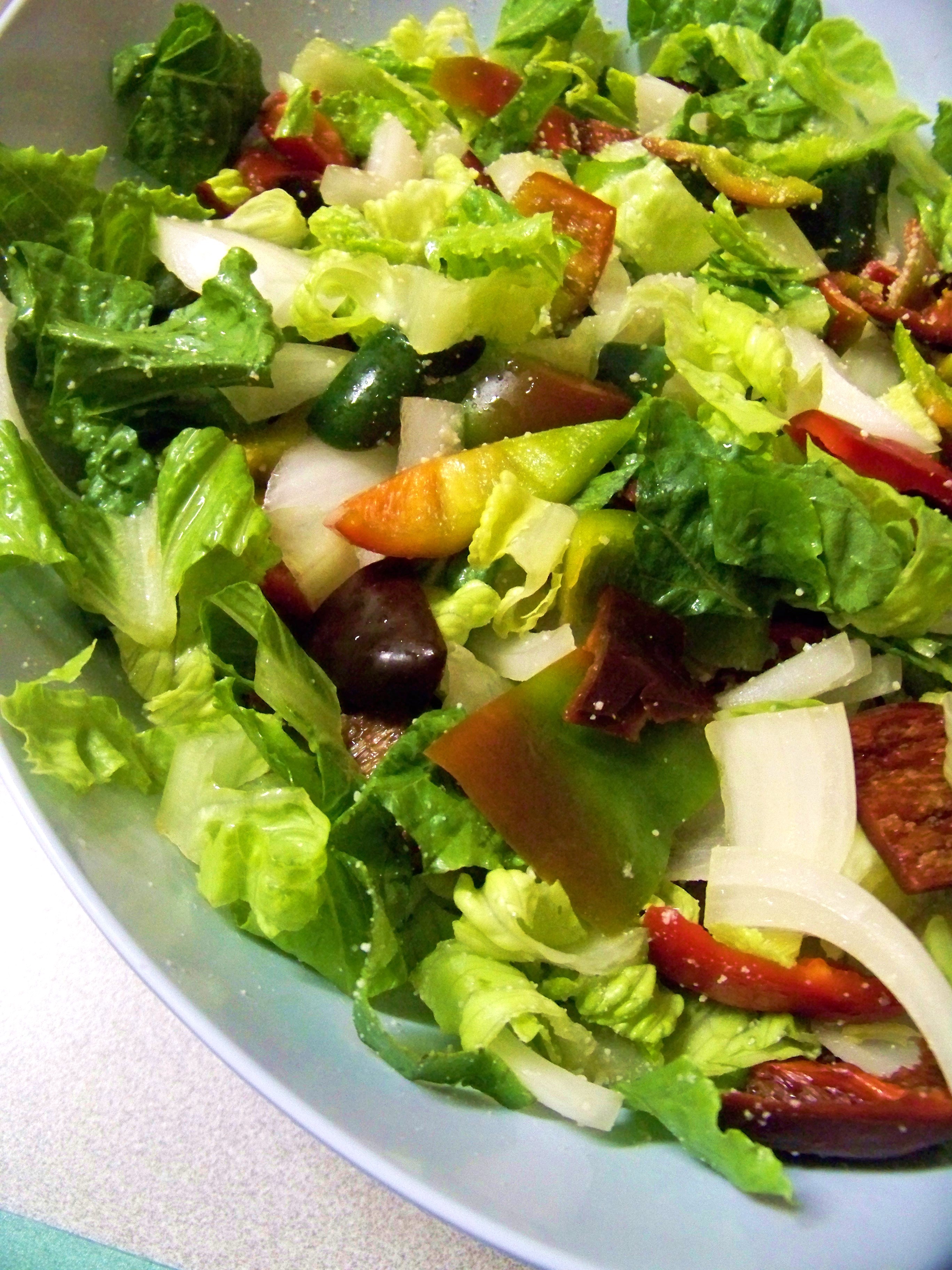 - Combine lettuce, peppers, and onion into a large Ziploc bag.