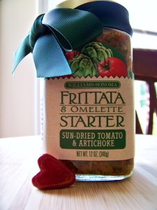 handed me the bag which had Williams-Sonoma scrolled across it. For a foodie, the gift bag is just an appetizer to a wonderful gift! I opened the bag to reveal a neatly wrapped jar. I could only imagine what would be in this jar with the green ribbon tied around it’s packaging. Williams-Sonoma has the best selection of specialty foods in their stores. After unwrapping, I found a jar of Sun-Dried Tomato and Artichoke Frittata and Omelette Starter. I certainly had my reservations about the artichoke part, but it was going to be something new to try, and Williams-Sonoma has NEVER steered me wrong with their items or their recipes (nor has Sara). So, excited I was to receive it, and excited I was to prepare the recipe on the jar.
