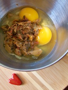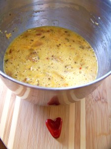 - 2 spoonfuls of the Starter (Or, any tasty vegetable and seasonings of choice…however, I do recommend the ease of the Starter. If you like your veggies softer, sauté them a bit and allow them to cool completely before adding them to your eggs.)