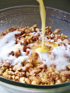 - Mix the nuts with cinnamon, 1/4 cup sugar, and 1/4 cup of melted butter. Set aside.