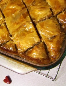 Cook’s Notes: Walnuts can be replaced by any kind of nuts or a combination of nuts. (I used 4 cups of walnuts, and 2 cups of pecans.)Phyllo pastry is available in the freezer section of most grocery stores.
