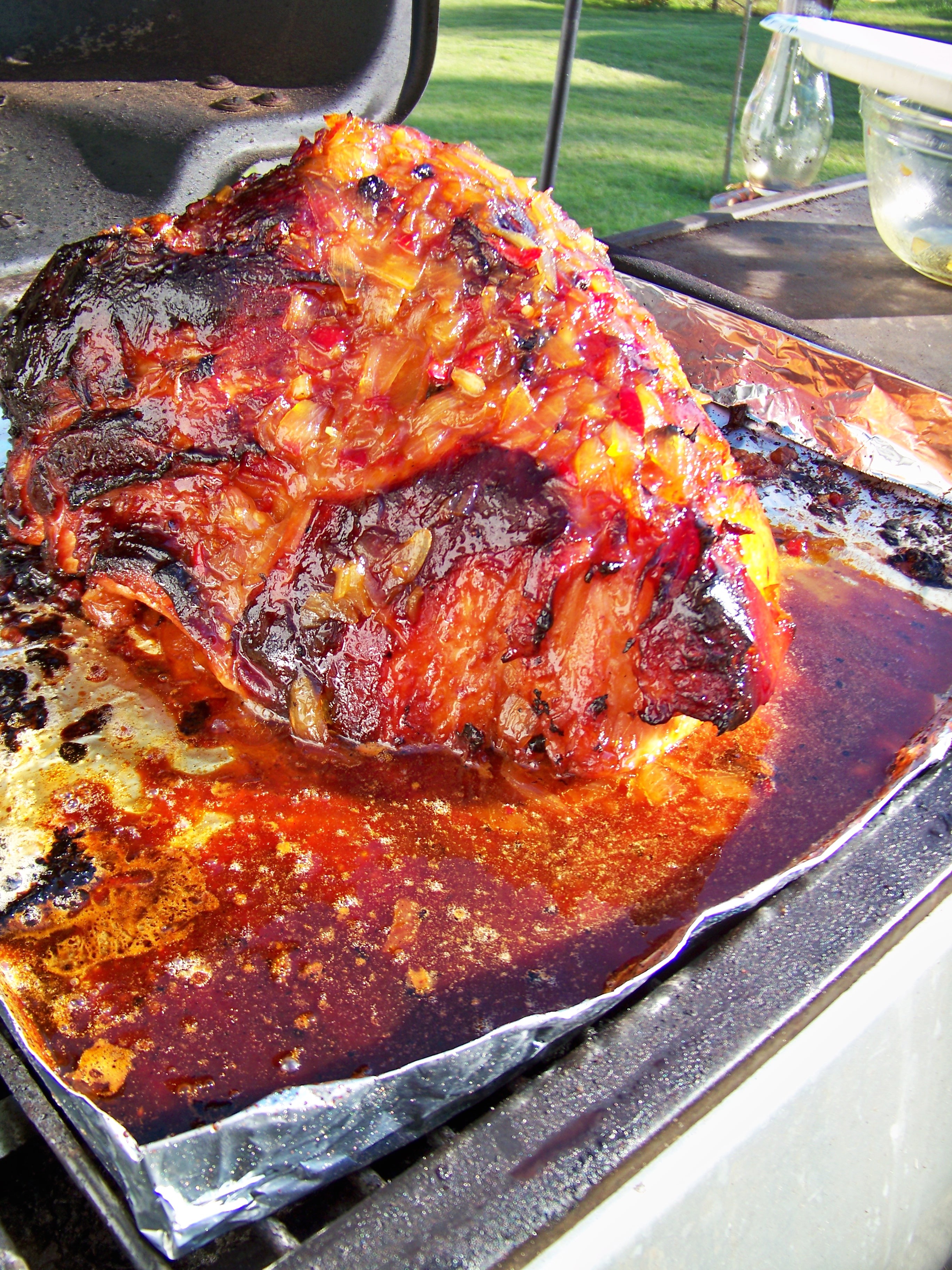 - “Glaze” the ham every 20 minutes or so while it’s on the grill with a basting brush (I sincerely recommend a silicone basting brush, don’t learn the hard way when you pull bristles out of your teeth).