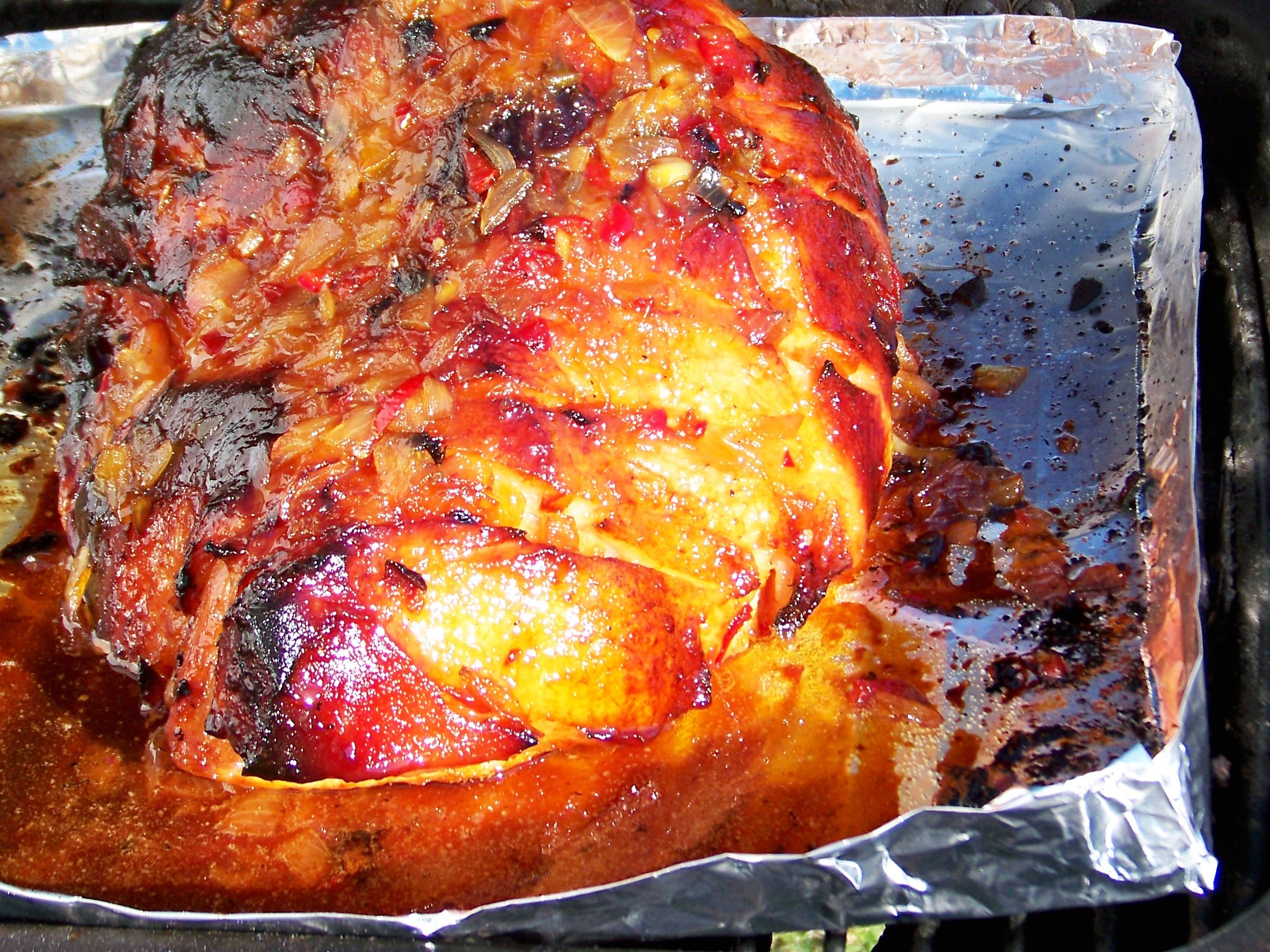 used (after 30 minutes of googling), I’m just going to wing it. This ham the hub grilled is just too good not to go ahead and share. Let’s be honest, this ham and the Foo Fighters are neck and neck for brilliancy in my book. And yes, I said he GRILLED a ham. It’s the perfect thing to do on the holidays, because you don’t have to use up your oven space. That way the sweet potato casserole, the sausage-apple stuffing, the corn pudding, the pumpkin pies, and the cream cheese mashed potatoes can all bake in peace. (Yes, Mom. That was a hint of things I want this holiday season. *smiles*)