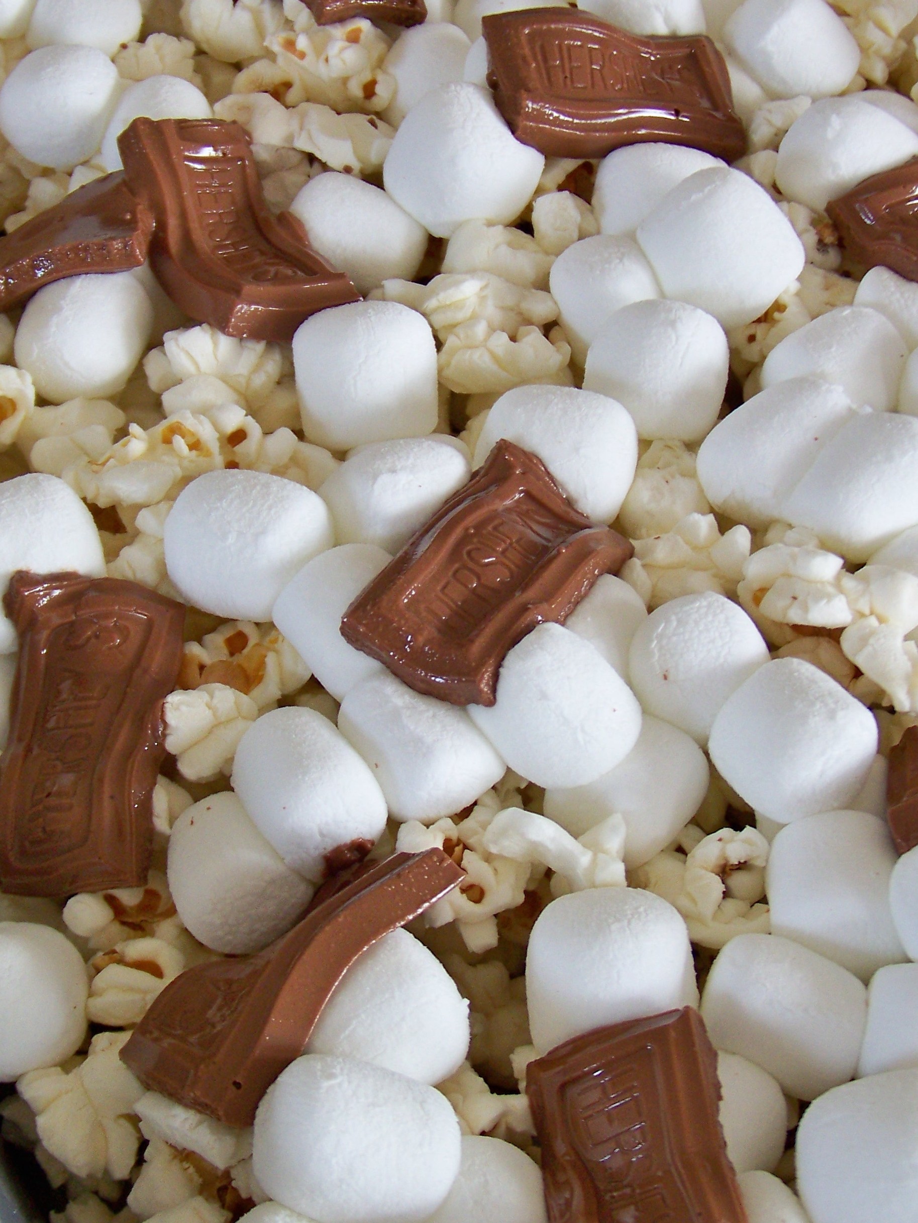 - Poor popcorn in a pan and break the chocolate bar in pieces on top of the popcorn, and sprinkle the marshmallows on top.