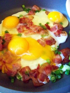 - Add the eggs, onions, salt and pepper to the skillet with the bacon and cook until the eggs are soft set (just before the doneness of how you would serve them).