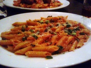 I had never had balsamic vinegar and olive oil both for bread dipping. It was so inspiring that I went to Midtown Olive Press in town and bought my own bread dipping combination the next week! The bread that was being brought out to our table had to of been baked in the back. It was fresh, soft, and crusty, exactly what you would expect out of good bread. Goodness though, we had to take it easy on the bread or we were NOT going to have room for our meal. Out came the Penne alla Vodka that I had already planned on ordering, and the Sausage, Peppers, and Onions dish the hub ordered. When I tell you we should have taken it easier on the bread, I mean it!