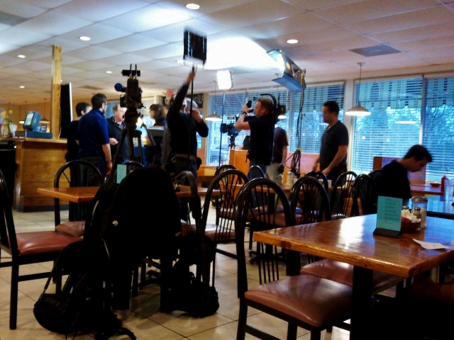 It only became more irritating as the production went on. After being rattled by his rudeness, we were all shuffled back outdoors for another 20 minutes in the rain. When we finally got in and settled into a booth out of the camera shot, he began the opening interviews with the restaurant owners. Bless their hearts…he was sadly, a jerk…as I believe some of you saw on the episode and asked me if he really was that mean off camera as well. We ended up being moved to the other side of the restaurant so we would be in natural lighting along with the production crew’s lighting. They began doing some taping of everyone seated….this is at about 11:30am. Keep in mind that we got here about 8:30am, and I think a majority of us were expecting some sort of breakfast service…cue growling tummys. Beside us there was a buffet, and guess who wanted to film some of the temperatures of the items sitting in the buffet??? Well, it was Chef Robert Irvine standing beside the buffet and yelling at the camera men to stand in certain positions and copping an attitude.