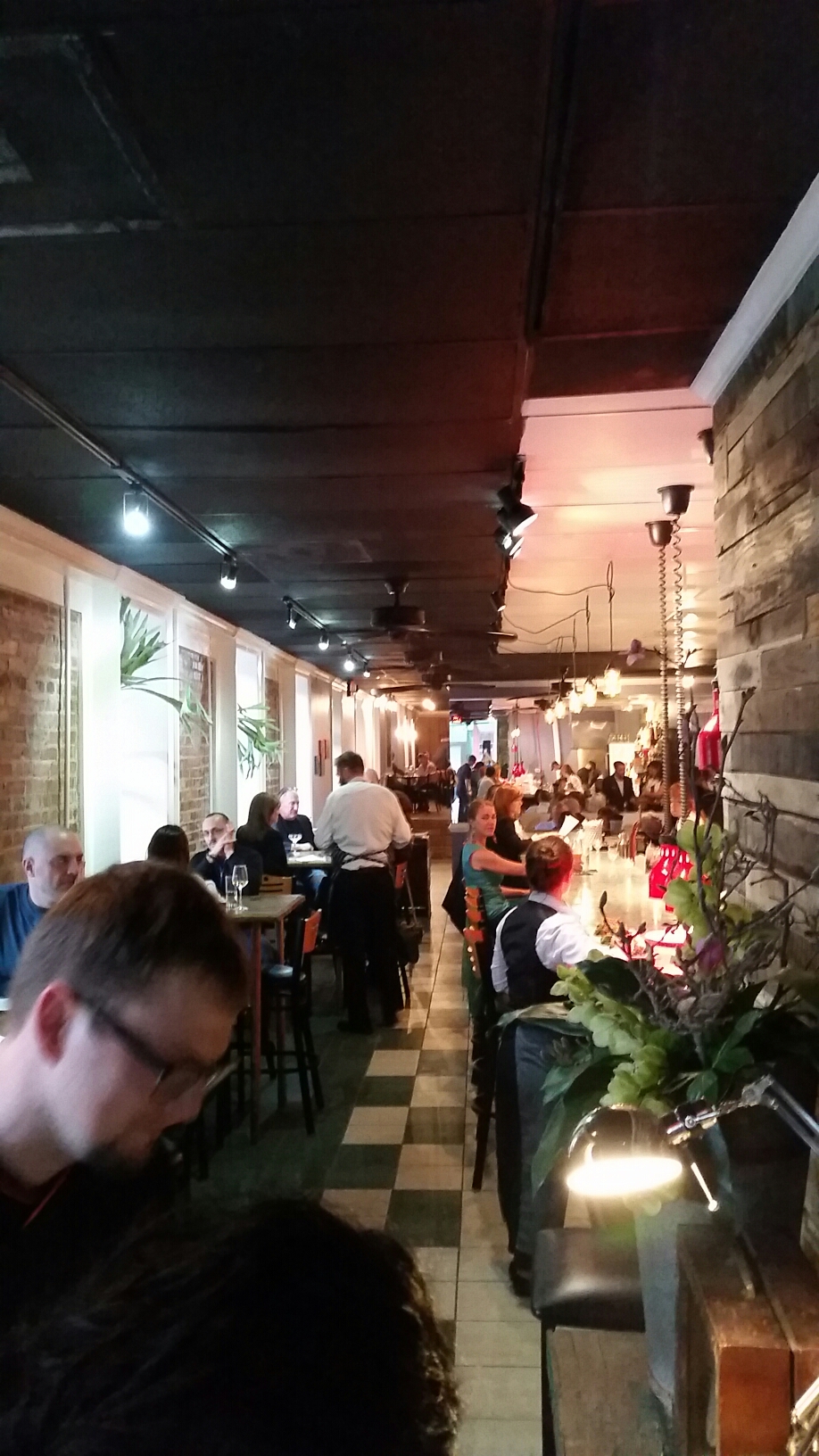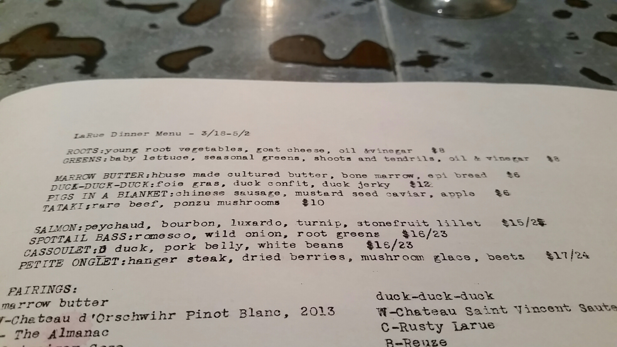 It’s a small French restaurant right across from the Carolina Theatre, and it’s owned and operated by a very passionate Chef. Trey Bell’s passion shows through in his staff and especially the food. The staff was involved in the prepping of the space, and it’s very evident they all have a great source of pride in LaRue. I find that very charming about this place. The use of reclaimed wood all throughout the restaurant on the walls, the handmade bar and top (that was all created or made by the staff) really brings this restaurant together and shows it can fit in with the trendy downtown crowd.