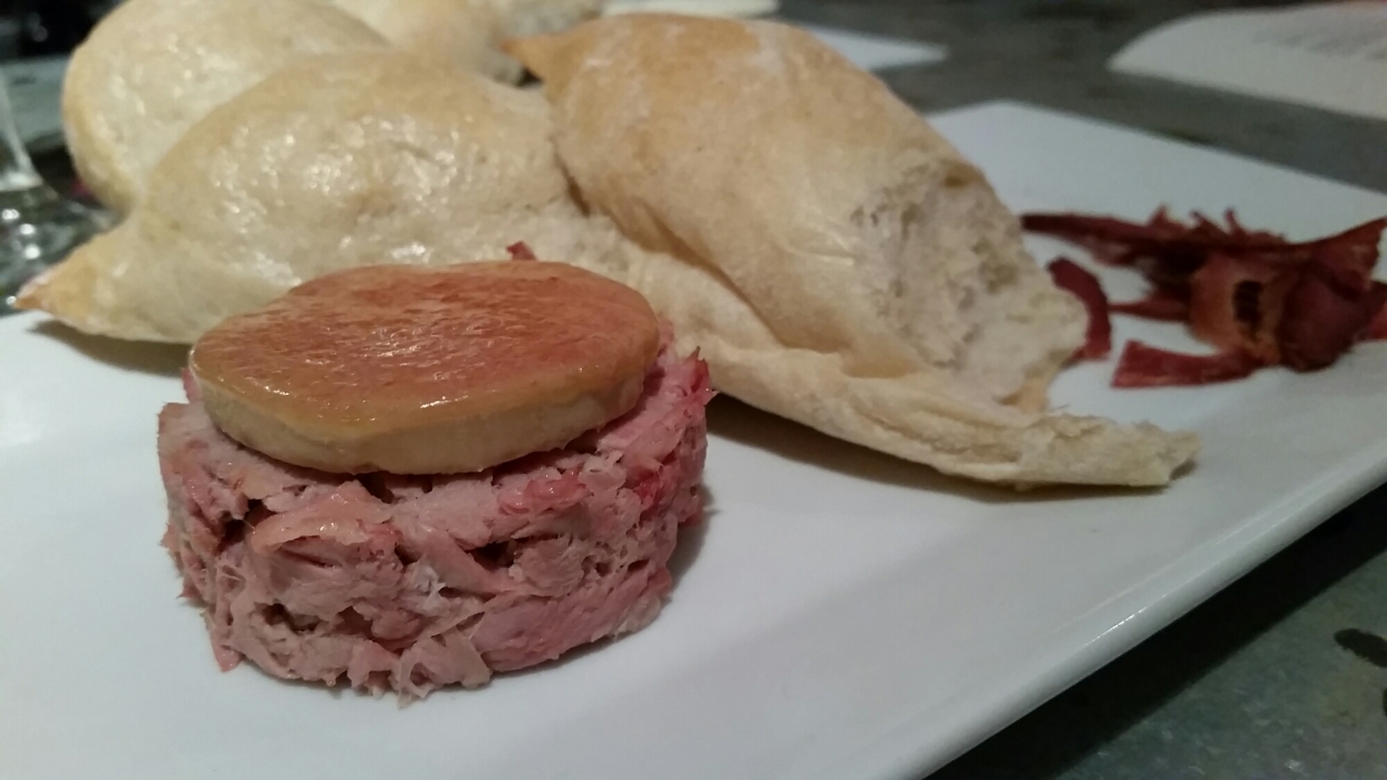 Marrow Butter was first up – house made cultured butter, bone marrow, and epi bread. The bread is brought in from Loaf Bakery, and it’s Trey’s actual recipe/creation. The bread was prefect with a chewy outside and soft on the inside. $6