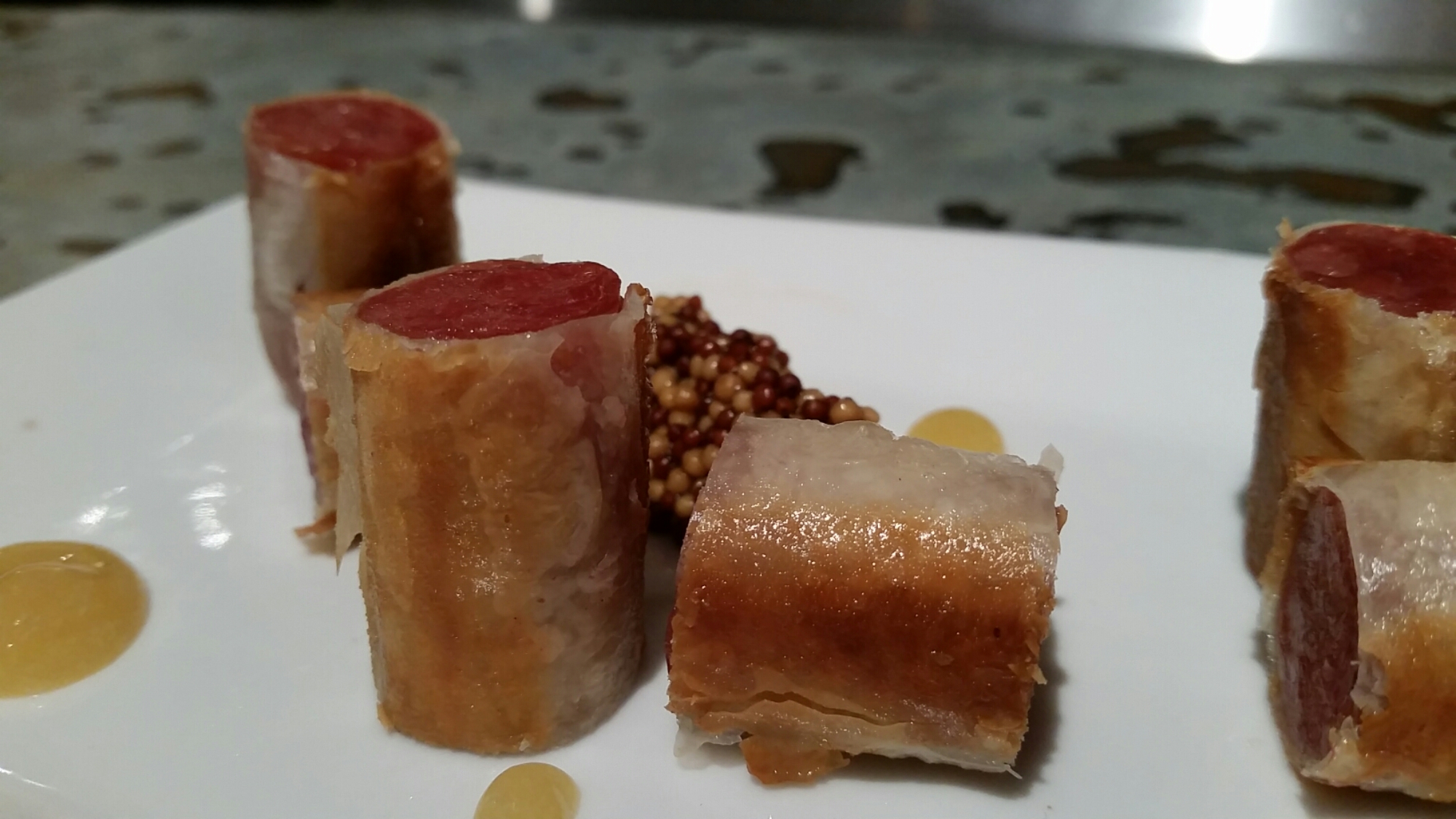 Pigs in a Blanket was next – while it’s not my traditional Southern experience of Pigs in a Blanket, it was extremely tasty. The Chinese sausage wrapped in phyllo was spot on delicious with the mustard seed caviar. $6