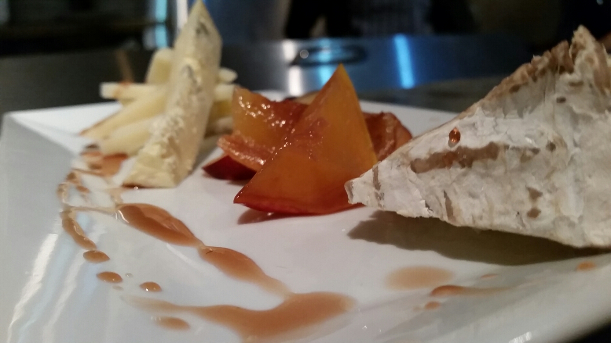 Instead of dessert, we ended with a beautiful and delicious cheese plate. All three of the cheeses were accompanied perfectly with the peach, nectarines, and dried fruits.